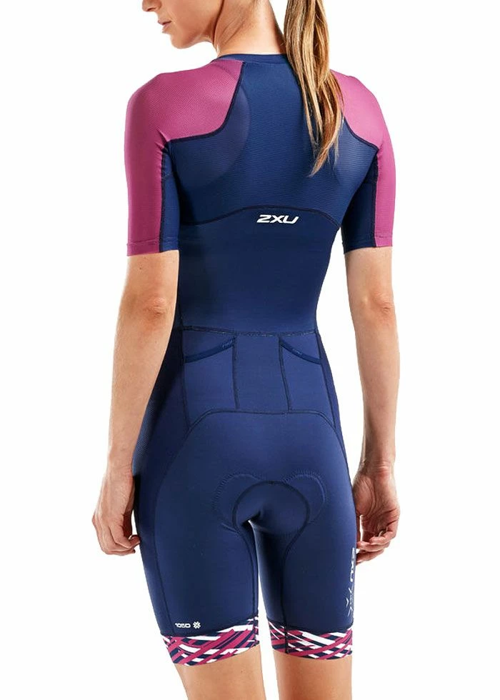 Designed with the long distance competitor in mind, the 2XU Women’s Compression Sleeved Trisuit incorporates 105D/CK fabrication with muscle mapping and ICE X cooling technnologies. Reduced muscle oscillation, cooling and UV blocking promotes endurance and provides protection against the challenges of long course racing; injury, fatigue, heat and the sun.