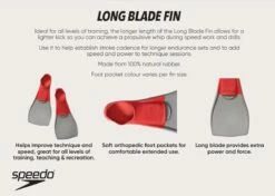 Ideal for all levels of training, the longer length of the Long Blade Fin allows for a lighter kick so you can achieve a propulsive whip during speed work and drills. Use it to help establish stroke cadence for longer endurance sets and to add speed and power to technique sessions. Comfortable to wear, it includes a soft foot pocket for a comfy fit and is made from 100% natural rubber. Colour varies according to fin size.
