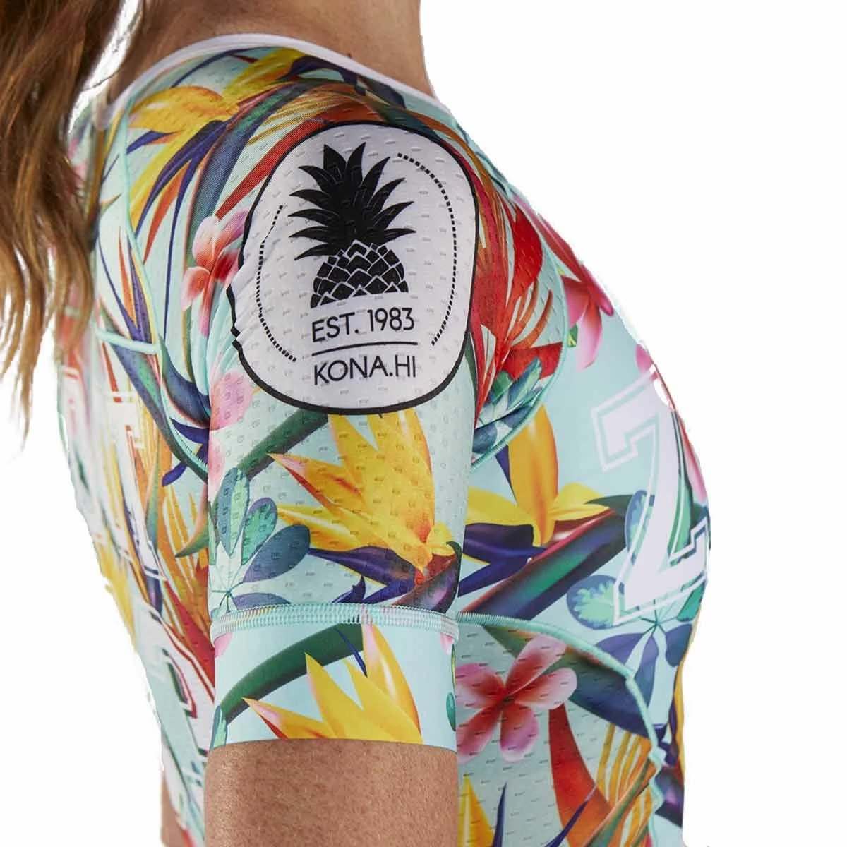 The Zoot Women’s 83 LTD Tri Aero Racesuit provides maximum comfort and freedom on race day. The racesuit is aero-cut with textured sleeves to reduce surface tension and increase speed on the bike.