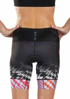 The new Zoot Women’s Ultra Tri 7″ Short in Ultra 19 design is constructed for plush riding comfort without extra bulk. The Ultra Tri 7″ Short boasts an Ultra TT CARBON Chamois. Enjoy 8mm of ultra density padding in the front and 3mm in the rear for maximum comfort and minimal bulk.