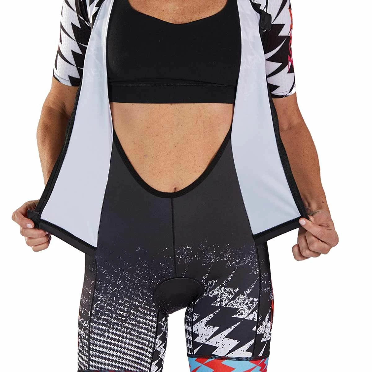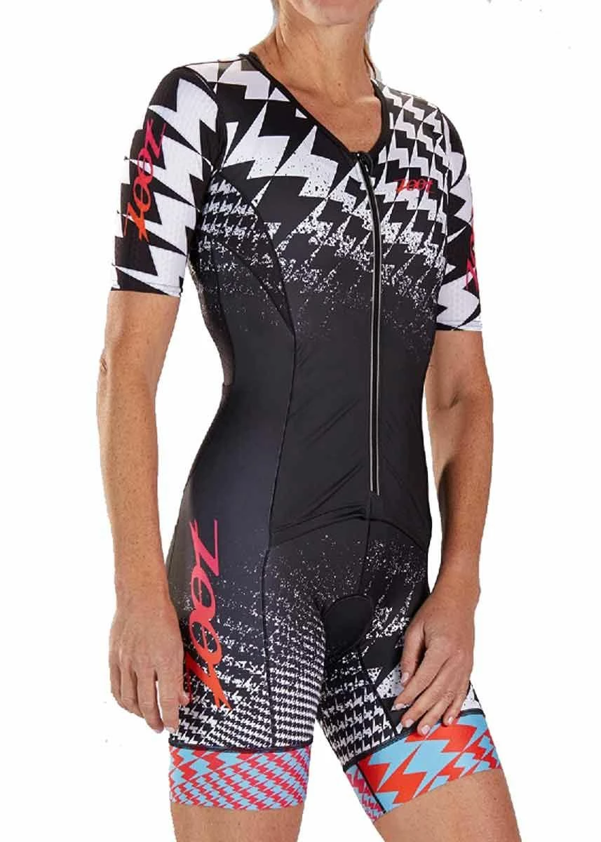 The new Women’s Ultra Tri Short Sleeve Aerosuit in the ultra 19 design is leading the way in technology advancements, Zoot is using Carbon fabric in the Racesuit for the most cutting edge performance benefits.